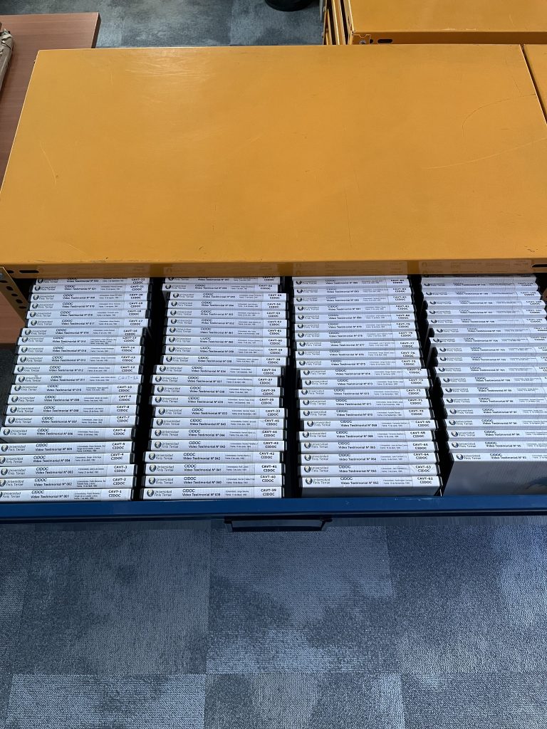 A la colección documental del CIDOC, se suma su catálogo audiovisual, disponible para consulta tanto para estudiantes de pre y postgrado como para investigadores externos. “Este archivo reúne entrevistas inéditas a importantes figuras de la historia de Chile, junto con documentales y programas de televisión que ofrecen diversas perspectivas sobre el período de la dictadura”, explicó Roxana Valdebenito, encargada del área de documentación del CIDOC.
